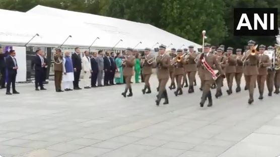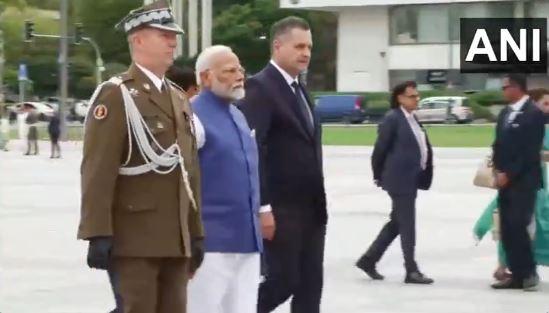 ก่อนการประชุมระหว่างผู้นำ นายกรัฐมนตรี โมดี ได้รับการต้อนรับอย่างยิ่งใหญ่ที่สถานเอกอัครราชทูตในวอร์ซอ โดยมีนายกรัฐมนตรีโปแลนด์ โดนัลด์ ทัสก์ เป็นประธาน